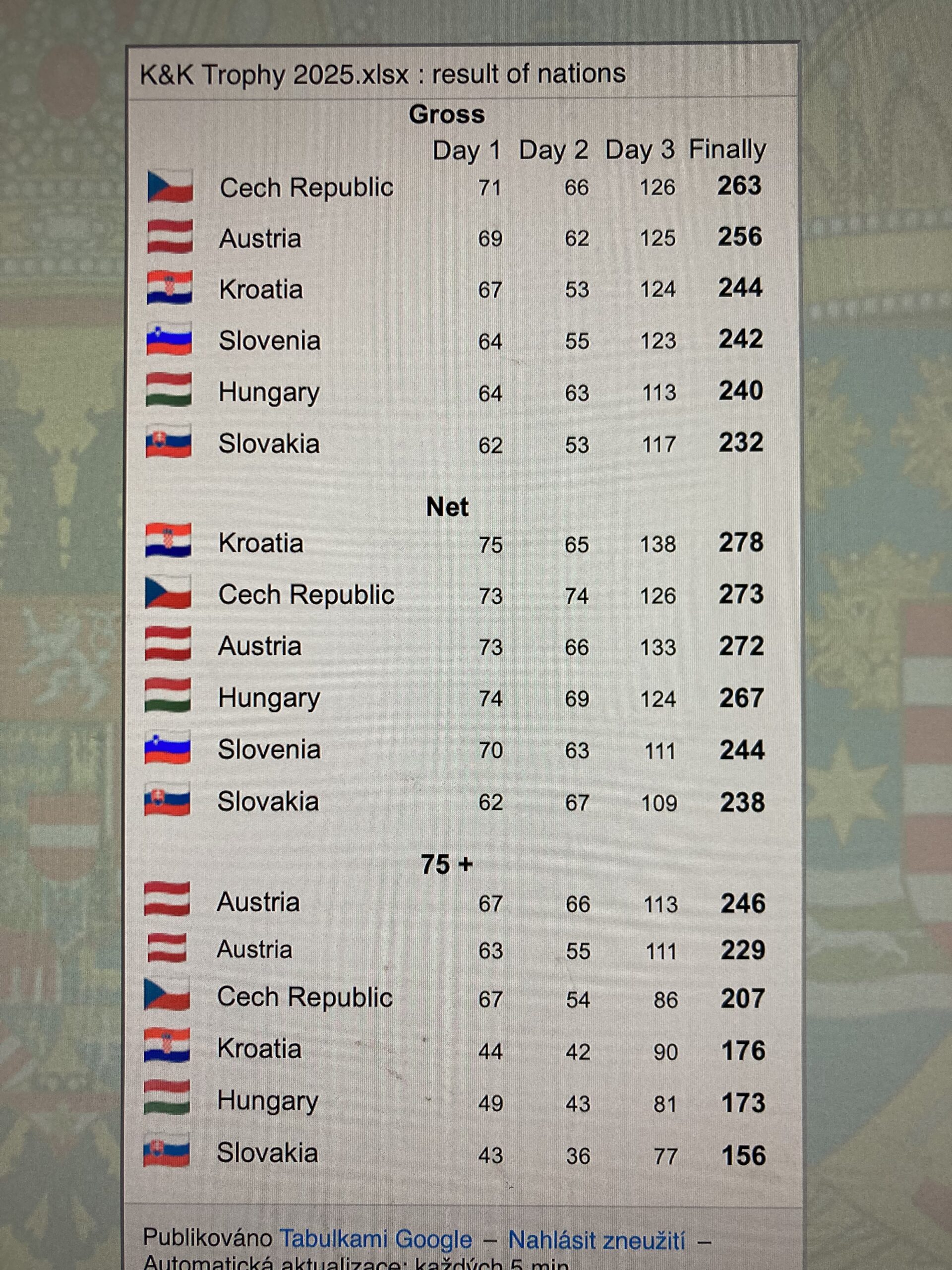 Ve dnech 1. – 5. června 2025 se uskutečnil již čtyřiadvacátý ročník K&K Monarchie Trophy v rakouském Stegersbachu v nádherné krajině spolkové země Burgenland. Rakušané předvedli nejenom tradiční pohostinnost a dobrou organizaci celé akce, ale povýšili prestiž mezinárodního seniorského turnaje na vyšší úroveň. Na účast zástupců města i vyšších územních celků na uvítací ceremonii a galavečeru už jsme zvyklí, také parádemarš městem už jsme zažili, ale televizní relaci v hlavních zprávách a zdravici od nejlepšího současného rakouského golfisty Bernda Wiesbergera nepamatuji. Skutečnost, že se někdo jiný než samotní účastníci zajímá o seniorský golf, byla mimořádně příjemná a zavazující. Naštěstí, jak se ukázalo později, právě naše družstva dokázala, že i senioři mohou předvádět golfovou kvalitu a zájem o něj nemusí být jen projev zdvořilosti.