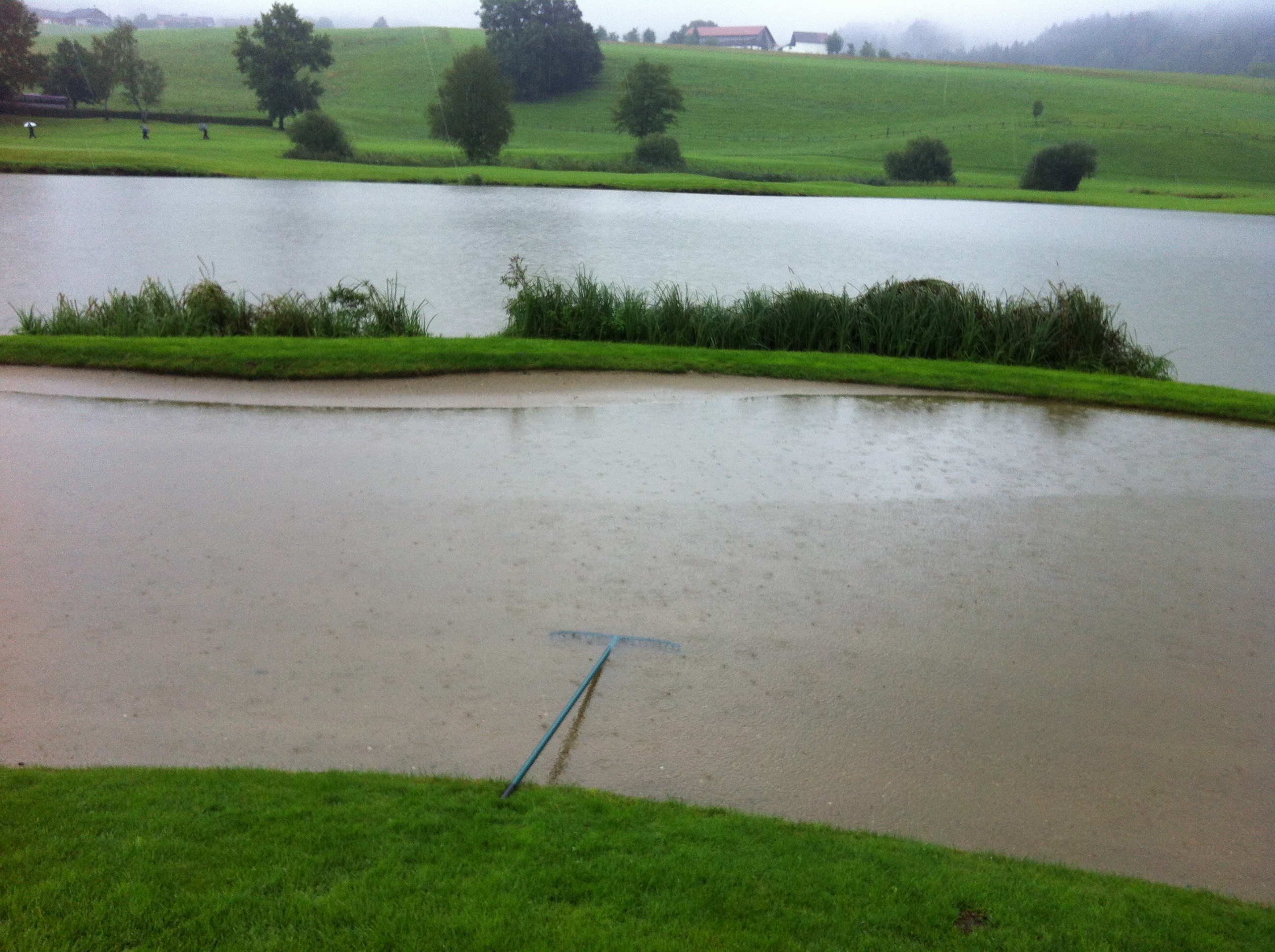A teď aktuálně z místa konání: podle informace prezidenta klubu od začátku července pršelo 46 dní a podle toho vypadá stav hřiště (viz foto). Cvičné kolo (1. 9.) a první soutěžní kolo (2. 9.) byly z důvodu nehratelného a podmáčeného hřiště zrušeny. Bohužel pršet nepřestává, a tak není vůbec jisté, kdy začne vlastní soutěž. Ale oficiální zahájení proběhlo a tak náš tým do ženského seniorského evropského golfu vstoupil.